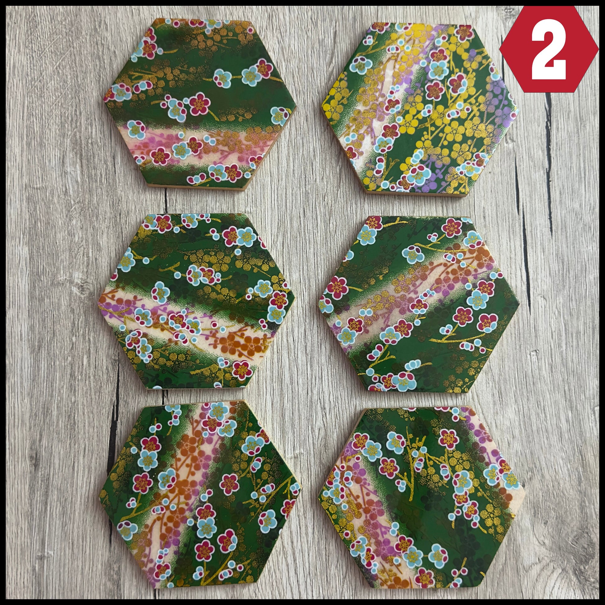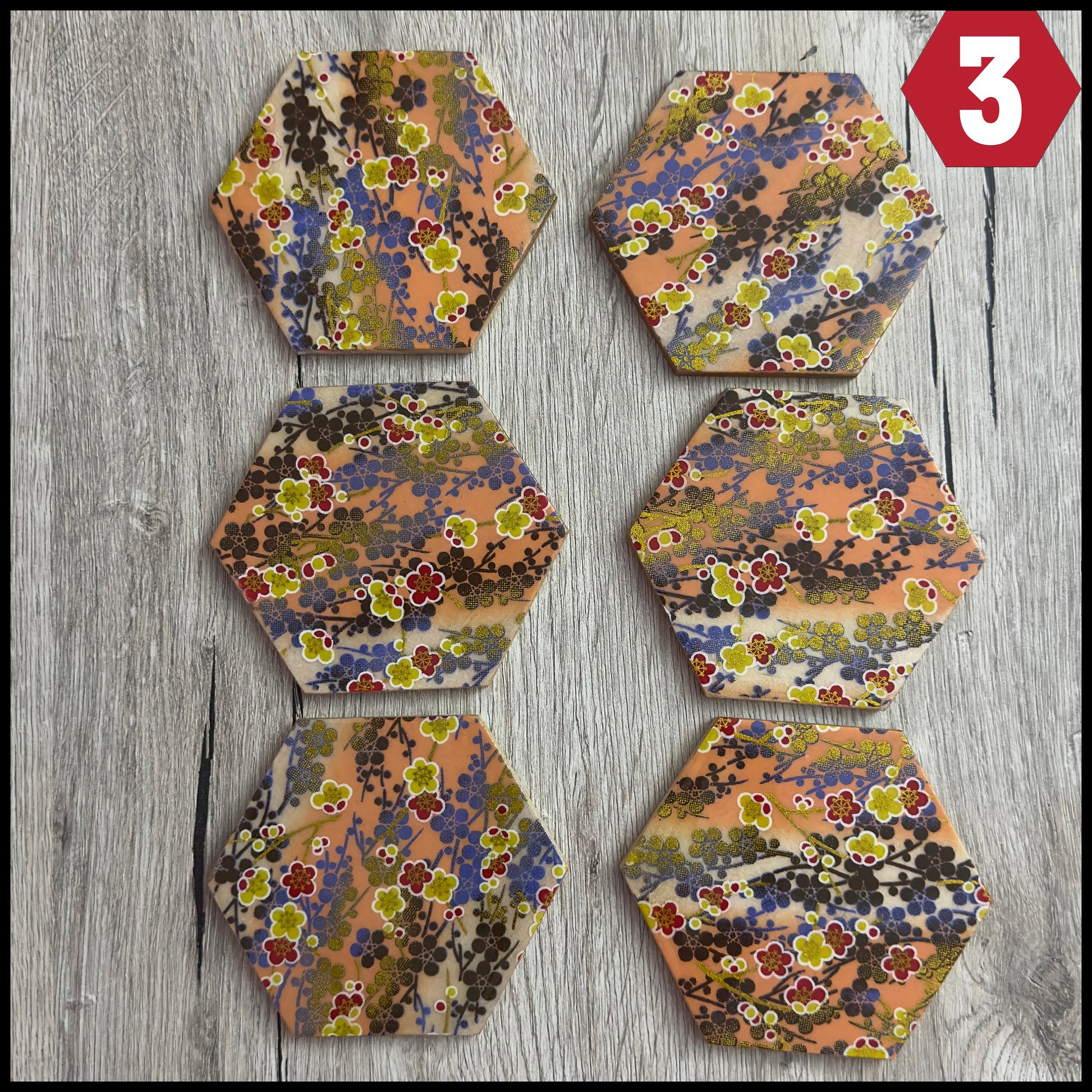 • Each set consists of 6 hexagon wooden coasters